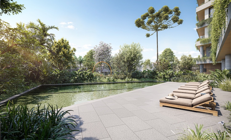 O projeto do PINAH preservou um bosque de araucárias, integrando-o à experiência dos moradores como área de contemplação e respiro urbano. Assim, o paisagismo nativo se soma aos acabamentos arquitetônicos para criar espaços de convívio acolhedores e discretos, como o lounge externo ao lado do espelho d’água e o caminho sombreado até a entrada.