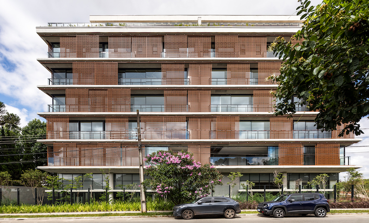 No AMPIO, essas simulações orientaram desde a implantação até o desenho das fachadas, garantindo a melhor insolação para os ambientes internos e a eficiência no controle térmico. As ilustrações e análises de desempenho permitiram definir a disposição das aberturas e o uso estratégico de brises fixos e móveis. Esses elementos, além de reforçarem a identidade visual do edifício, atuam como barreiras físicas contra a incidência direta de luz solar, proporcionando maior conforto térmico, autonomia para controle da luminosidade e privacidade para os moradores.