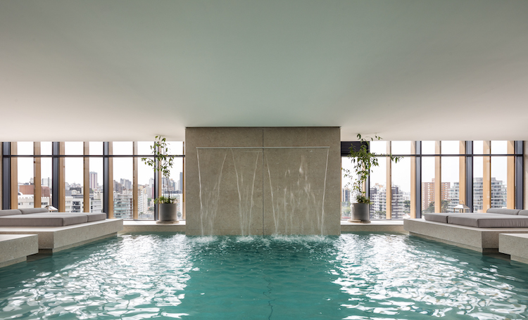 No VAZ Batel, o spa foi projetado como um verdadeiro refúgio urbano. O espaço reúne piscina aquecida com jatos de hidromassagem, cortina d’água, futons que parecem flutuar sobre a água e esquadrias 180° que permitem ampla entrada de luz solar. A ambientação e os materiais usados refletem a proposta de oferecer uma experiência de relaxamento e descompressão dentro do condomínio.