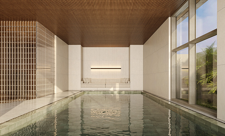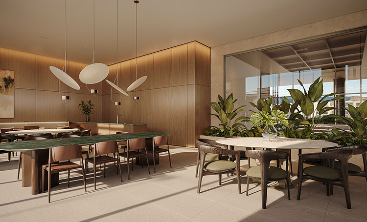 Já o paisagismo ganhou assinatura de Felipe Reichmann, que valorizou o traço curvo desenhado na ampla área posterior da torre, onde formas e espaços se encaixam de maneira orgânica: a piscina externa se conecta à interna; o salão de festas, ao terraço; e a área de estar, ao espaço pet e ao playground. “Tudo se conecta com uma grande praça emoldurada por vegetação. A escolha das espécies e dos materiais segue critérios rigorosos de certificação, alinhando paisagismo e qualidade à excelência da Laguna”, afirma Reichmann.