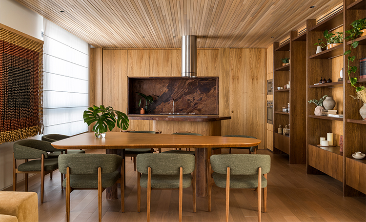 Assim como o projeto do ZAHI, esse ambiente é assinado pela Bernardes Arquitetura, traduzindo na prática os princípios arquitetônicos que orientam o projeto. A proposta valoriza materiais, proporções e soluções que evidenciam o estilo contemporâneo.